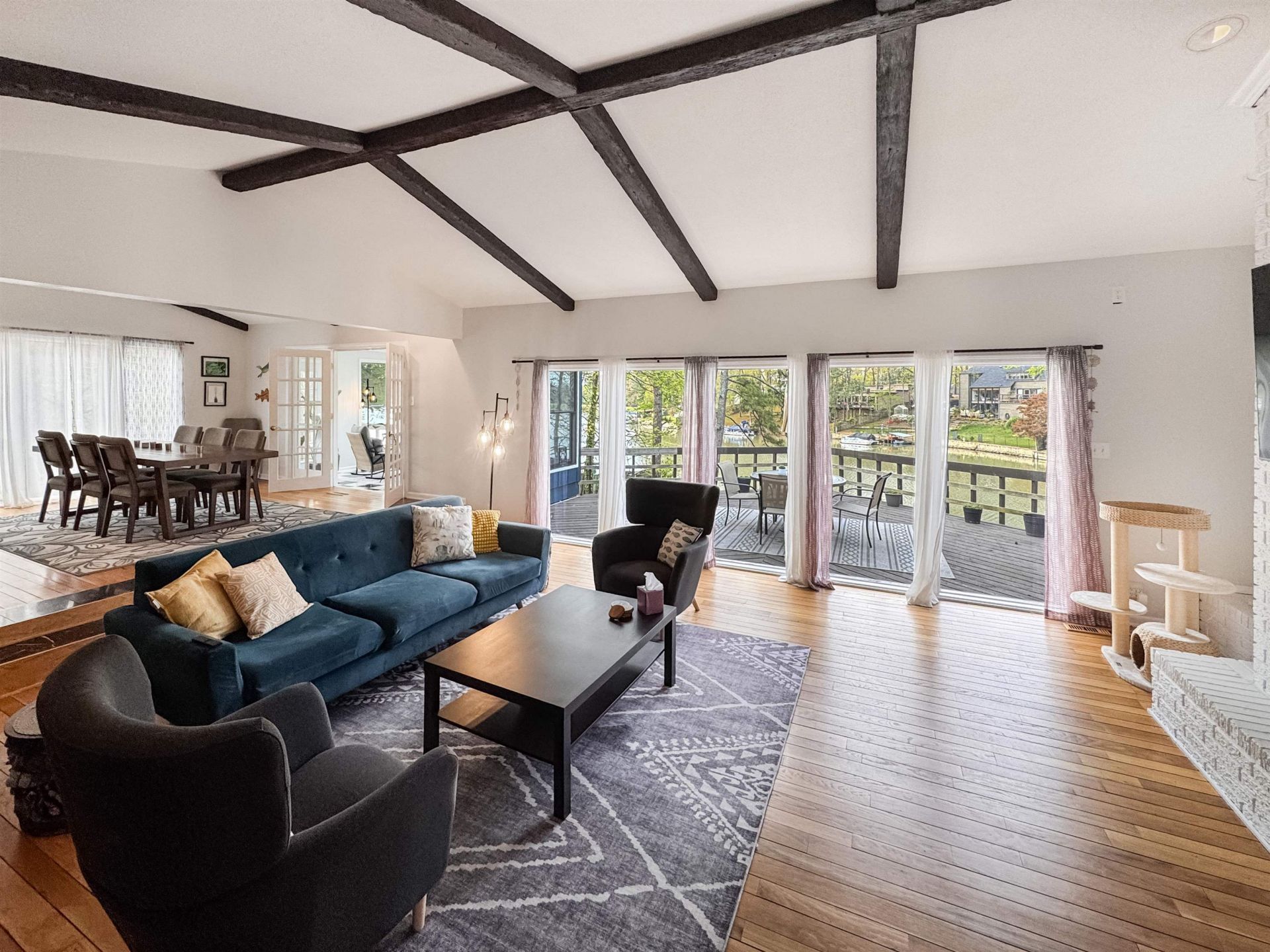 Spectacular lakefront living in sought after Walnut Grove Lake! This gorgeous home offers breathtaking, 'out of this world water views from nearly every angle. Enjoy the glistening lake from the spacious den with fireplace, raised dining room, and sunroom with floor to ceiling windows. The inviting primary also offers a lake views & features custom painting and a beautifully renovated bath. Two other bedrooms and another updated bath is located on the main level. The walkout finished basement includes a huge bonus room with bar and fireplace perfect for entertaining as well as an office and br. Step outside to expansive upper and lower decks, ideal for relaxing among the trees and soaking in the peaceful setting. An oversized dock and solar powered pontoon boat make lake living effortless. Pretty hardwood floors and textured ceilings up add charm throughout. Roof is less than 1 year old. This private oasis offers the feel of a vacation retreat with all the conveniences of city living!