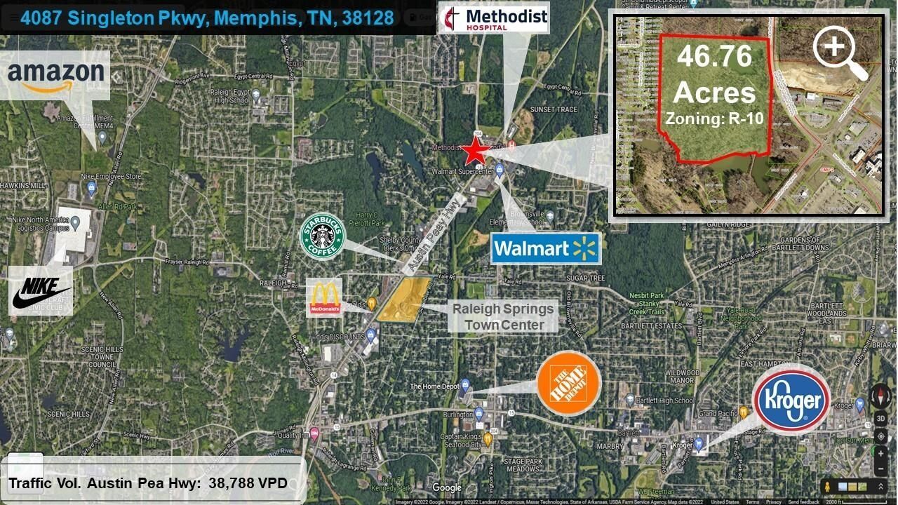 This 47 acres R-10 Zoned property presents a great development opportunity with 620 feet of road frontage on Singleton Pkwy. AADT is 32K Cars/Day The area has seen growth with new businesses like Starbucks, Chic-Fil-A, and the multi-million-dollar Raleigh library. Walmart, Kroger, Methodist North hospital, and other businesses are within a quarter-mile radius. Ford's Blue Oval City is less than 40 minutes away. Potential developments include residential, religious facilities, schools, medical, retail, mobile homes, senior living, and more. Contact me for details.